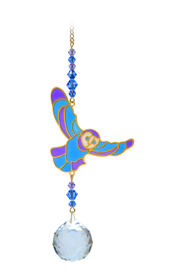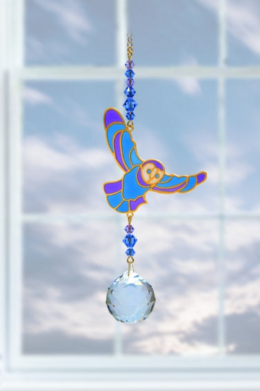 Introducing the Crystal Dreams™ Owl in Flight Moonlight Rainbow Maker Suncatcher, a graceful addition to Wild Things vibrant range. This elegant piece features a striking gold motif with a vivid stained glass effect, encircled by complementary beads in a captivating moonlight colorway. It is beautifully finished with a 20mm brilliant-clear crystal ball pendant, creating a stunning display of rainbow effects. Meticulously handcrafted in Devon, this exquisite suncatcher is imbued with a sentiment tailored for night owls