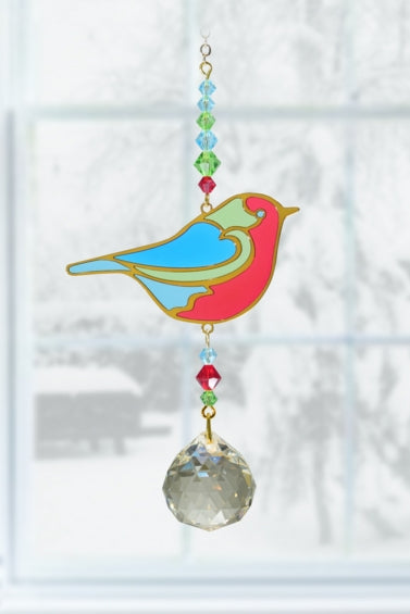 Introducing the Crystal Dreams Robin Rainbow Maker Suncatcher, a cherished addition to Wild Things range. This beloved robin features a radiant gold motif with a lively stained glass effect, framed by complementary beads in a russet red colorway. It is expertly finished with a 20mm brilliant-clear crystal ball pendant, delivering a spectacular display of rainbow effects. Meticulously handcrafted in Devon, this suncatcher embodies sentiments of new growth and renewal.