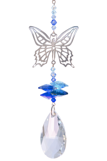 Introducing the enchanting Crystal Fantasies Butterfly Rainbow Makers and Suncatchers by Wild Things, handcrafted here in Devon. These delightful Butterfly Crystal Fantasies feature a mirror-finished motif suspended between a matching bead run and a captivating crystal cascade in the vibrant colors. Finished with a brilliant clear crystal pendant to amplify its mesmerizing rainbow effects. With an overall length of 230mm, width of 38mm, and depth of 24mm, this suncatcher adds a touch of natural wonder to any space.