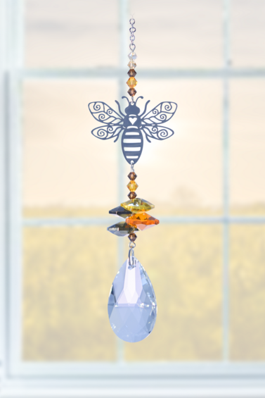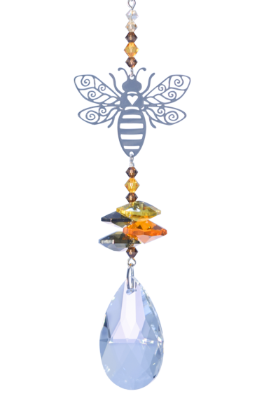 Introducing our captivating Crystal Fantasies Bee Rainbow Maker Suncatcher from Wild things, meticulously handcrafted here in Devon. This industrious Bee Crystal Fantasy showcases a mirror-finished motif suspended between a matching bead run and a stunning crystal cascade in the warm Autumn Gold colorway. Finished with a brilliant clear crystal pendant to create mesmerizing rainbow effects. This delightful suncatcher measures an overall length of 233mm, width of 40mm, and depth of 24mm, making it a perfect addition to any space in need of a touch of natural beauty.