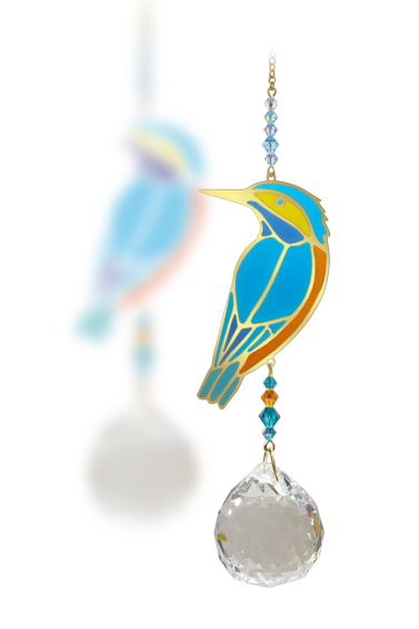 This attractive Kingfisher is part of the colourful Crystal Wonders® range from Wild Things. Sunlight casts beautiful displays of colour from the vibrant motif, framed in mirror gold, set between matching bead runs in the unique kingfisher colourway. Completed with a sparkling, 30mm crystal ball pendant for maximum rainbow-making effects.