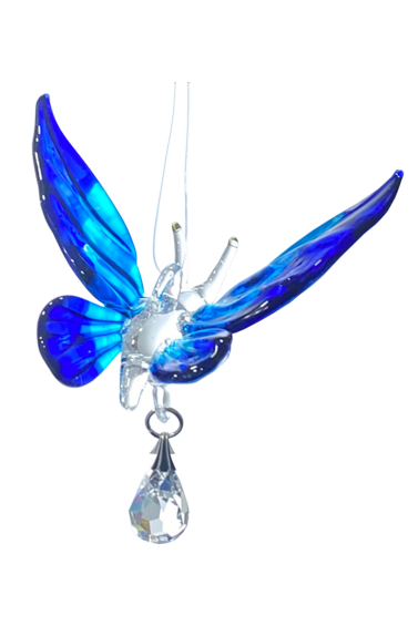 Fantasy Glass Butterfly Rainbow Maker and SunCatcher, an exquisite piece expertly crafted right here in Devon by Wild Things. Each Fantasy Glass Butterfly is meticulously blown and hand-painted, presenting vibrant colors and adorned with premium crystal teardrops. They come individually packaged in an illustrated and eco-friendly cardboard box.
