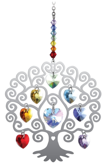 Introducing the Pure Radiance Tree of Life Rainbow Maker Suncatcher, a handcrafted masterpiece that gleams with hearts and sparkles. This mirror-finished Tree of Life from Wild Things is truly stunning! The Chakra colorway features seven premium-quality 10mm crystal hearts, with a dazzling 14mm Aurora Heart at its center.