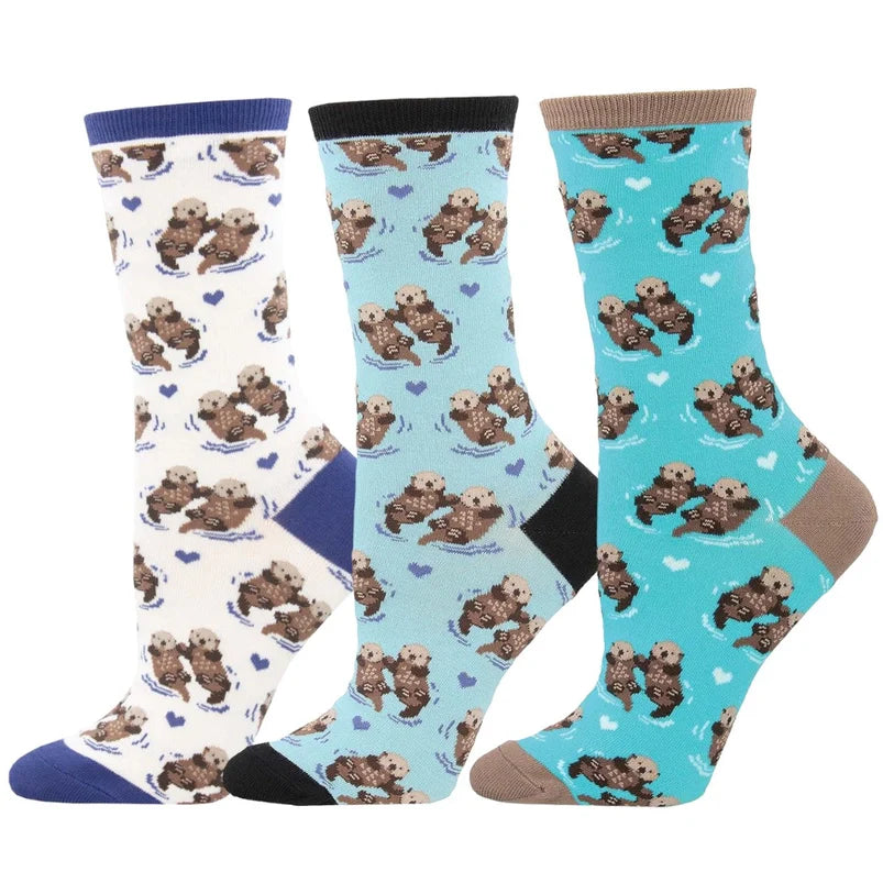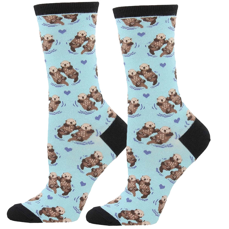 Charming light blue socks featuring otters, crafted from 45% cotton, 52% nylon, and 3% spandex. Perfect for adults sizes 3-7 and guaranteed to keep your feet cozy with a splash of fun.