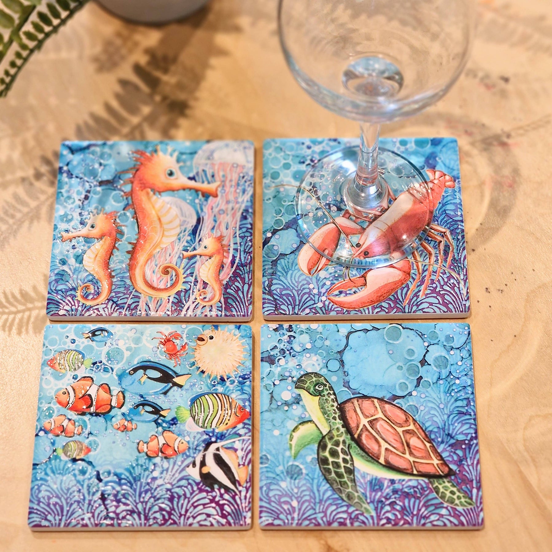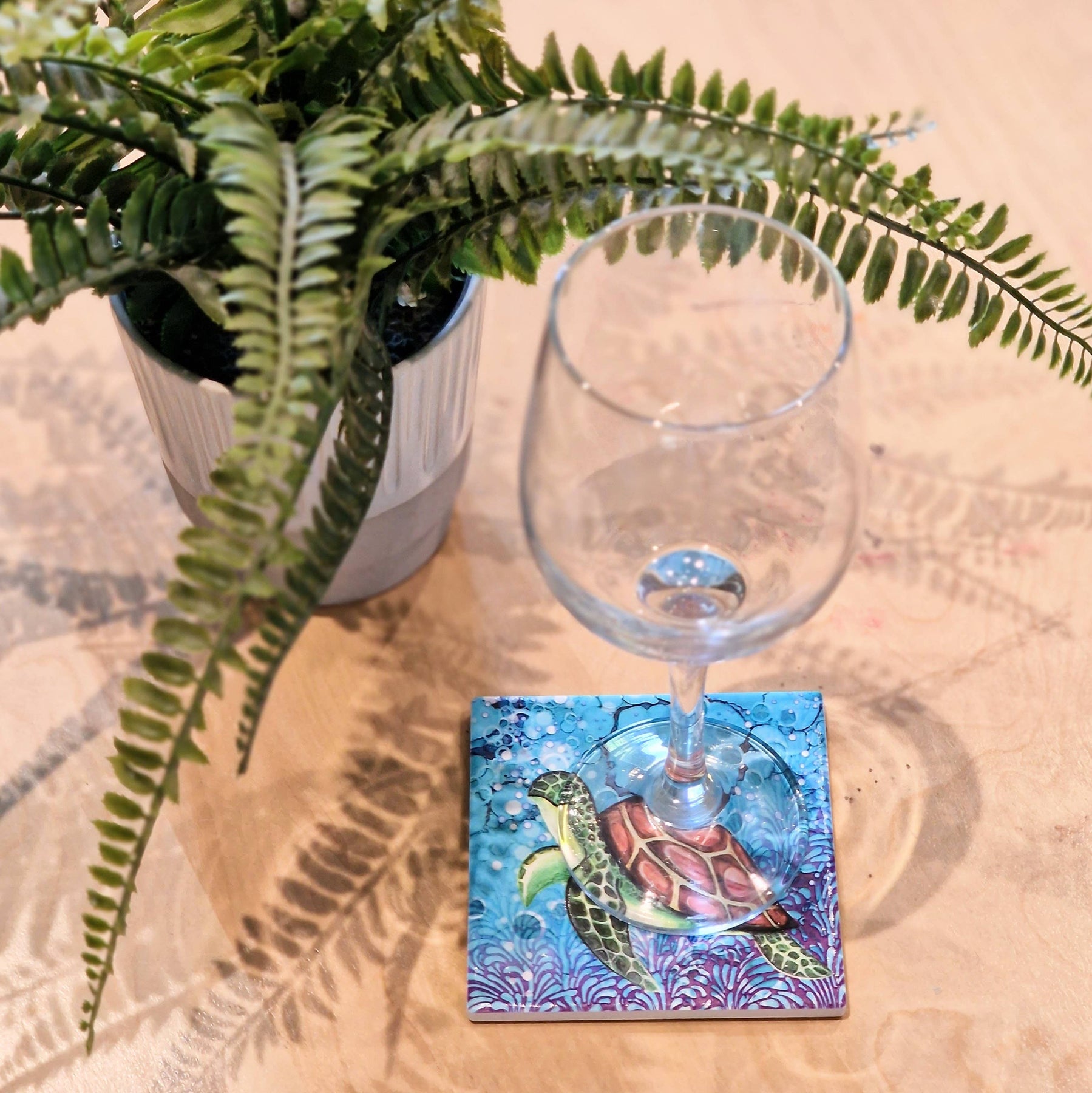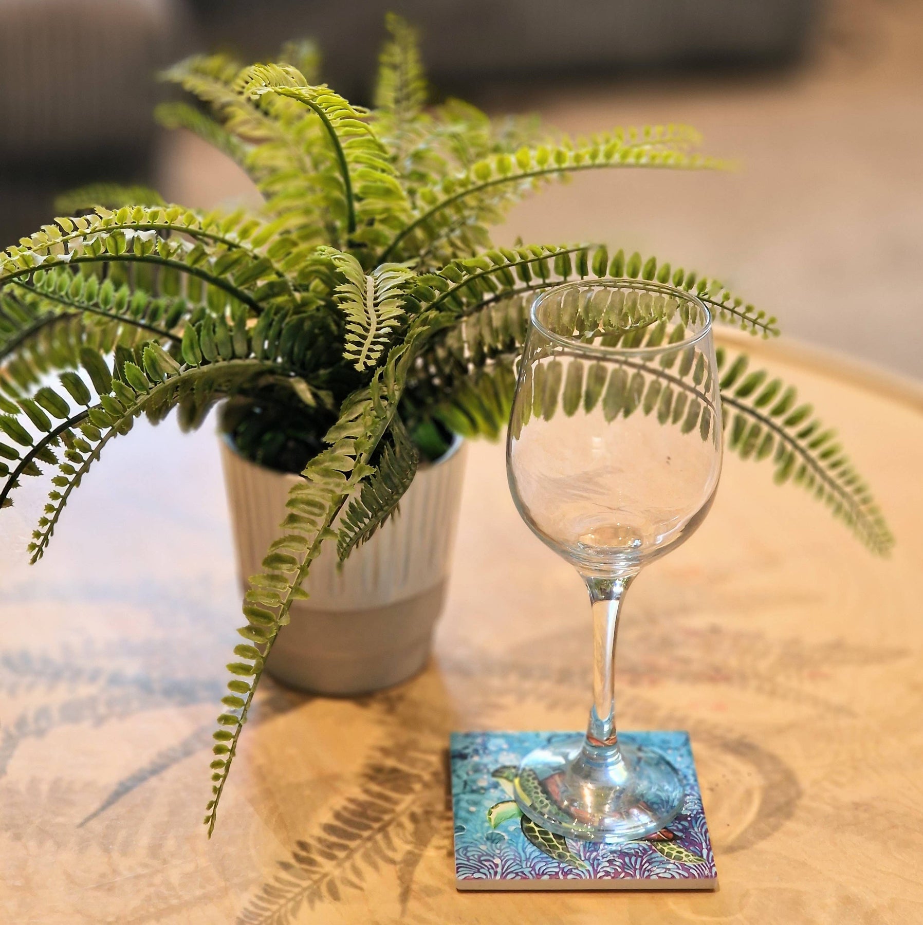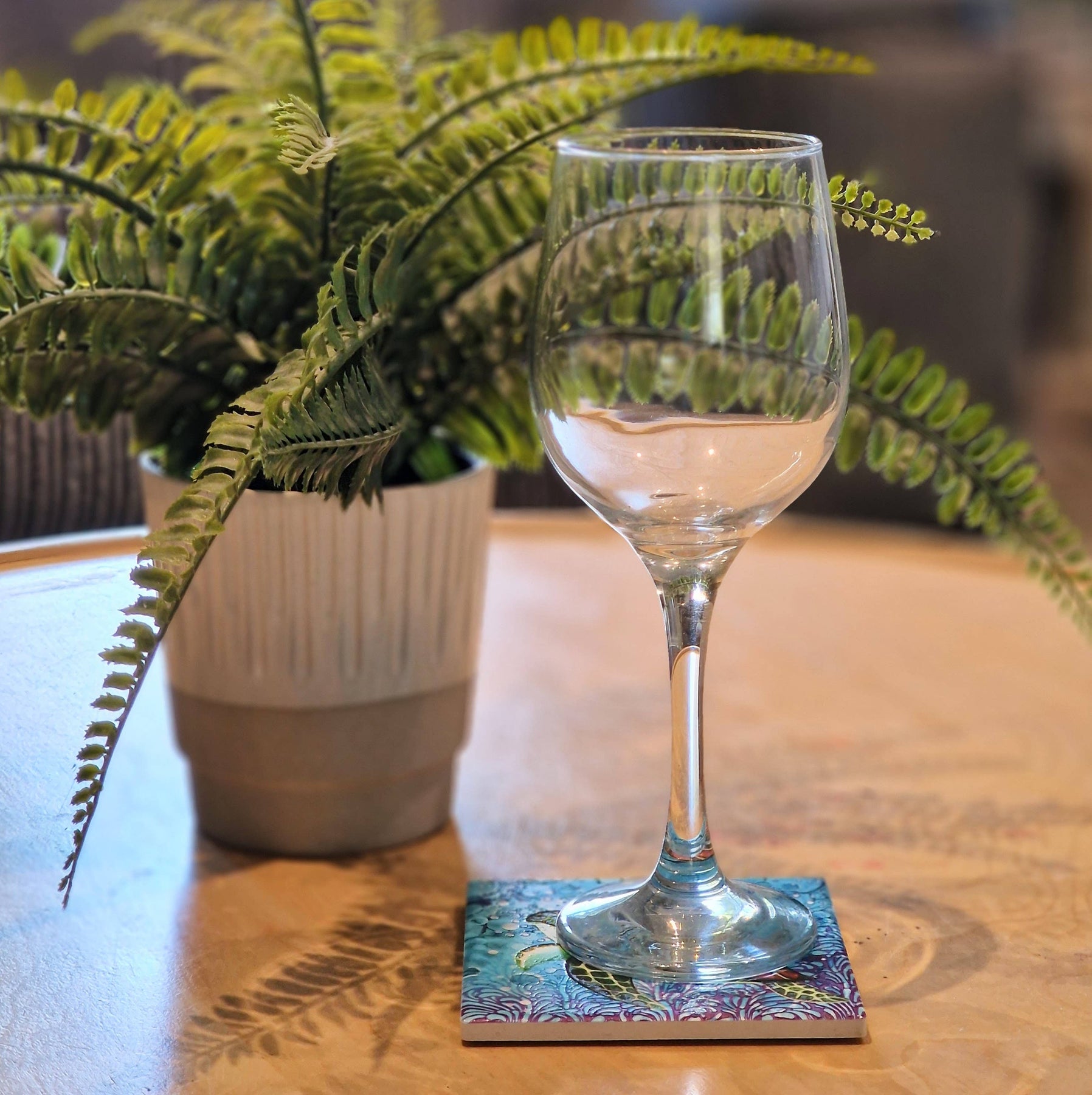Colours inspired by nature and water, and these ceramic coasters are just that. The colours blend effortlessly on the ceramic bringing nature right into the room with you. MEASUREMENTS Each coaster measures 10cm square and comes with a cork back to prevent movement or scratching on the unit/ table and comes with an embossed texture, making them almost 3D like.