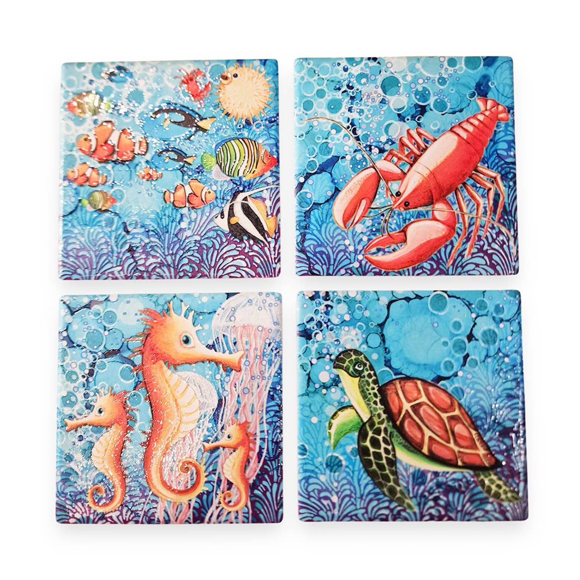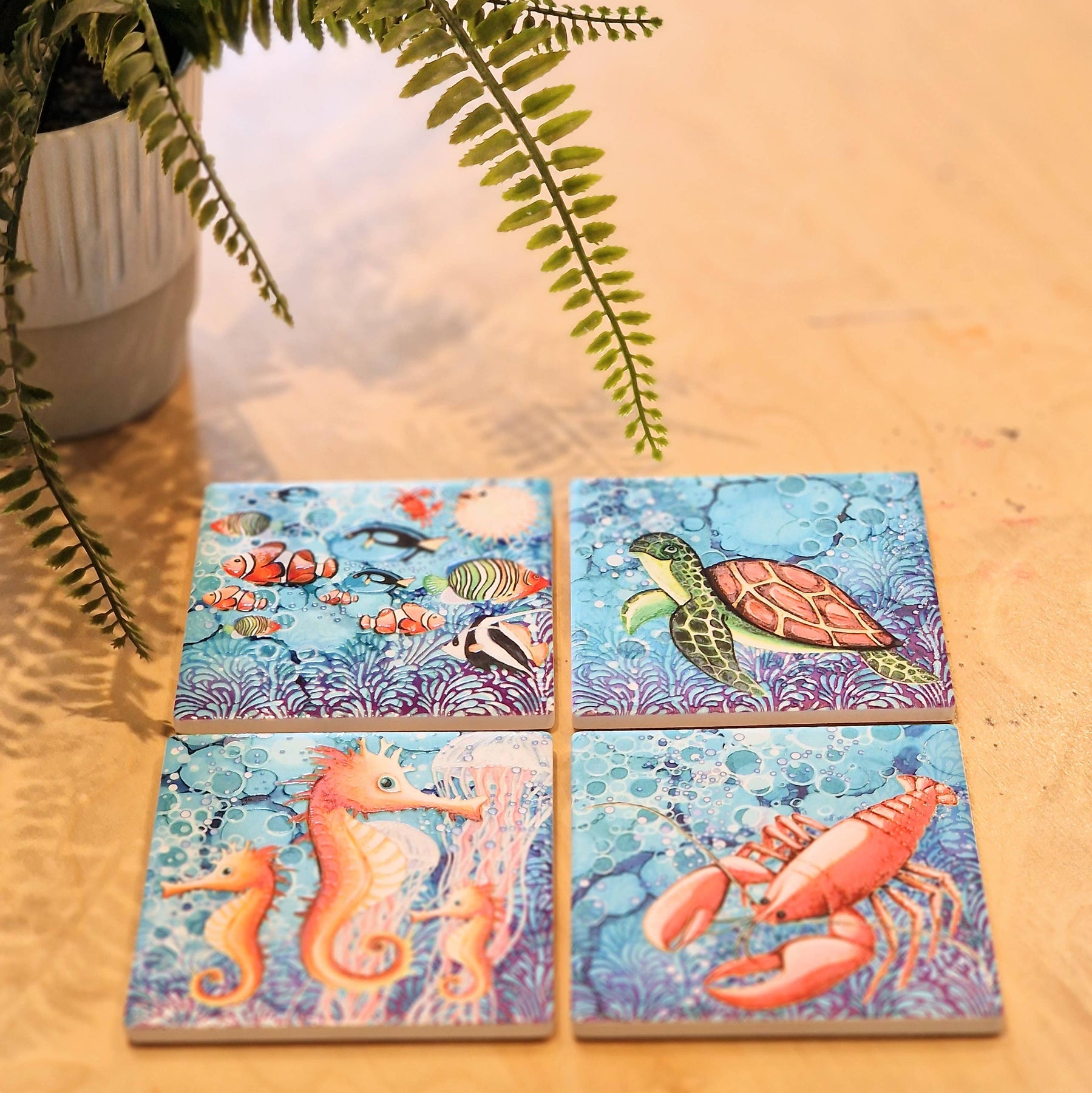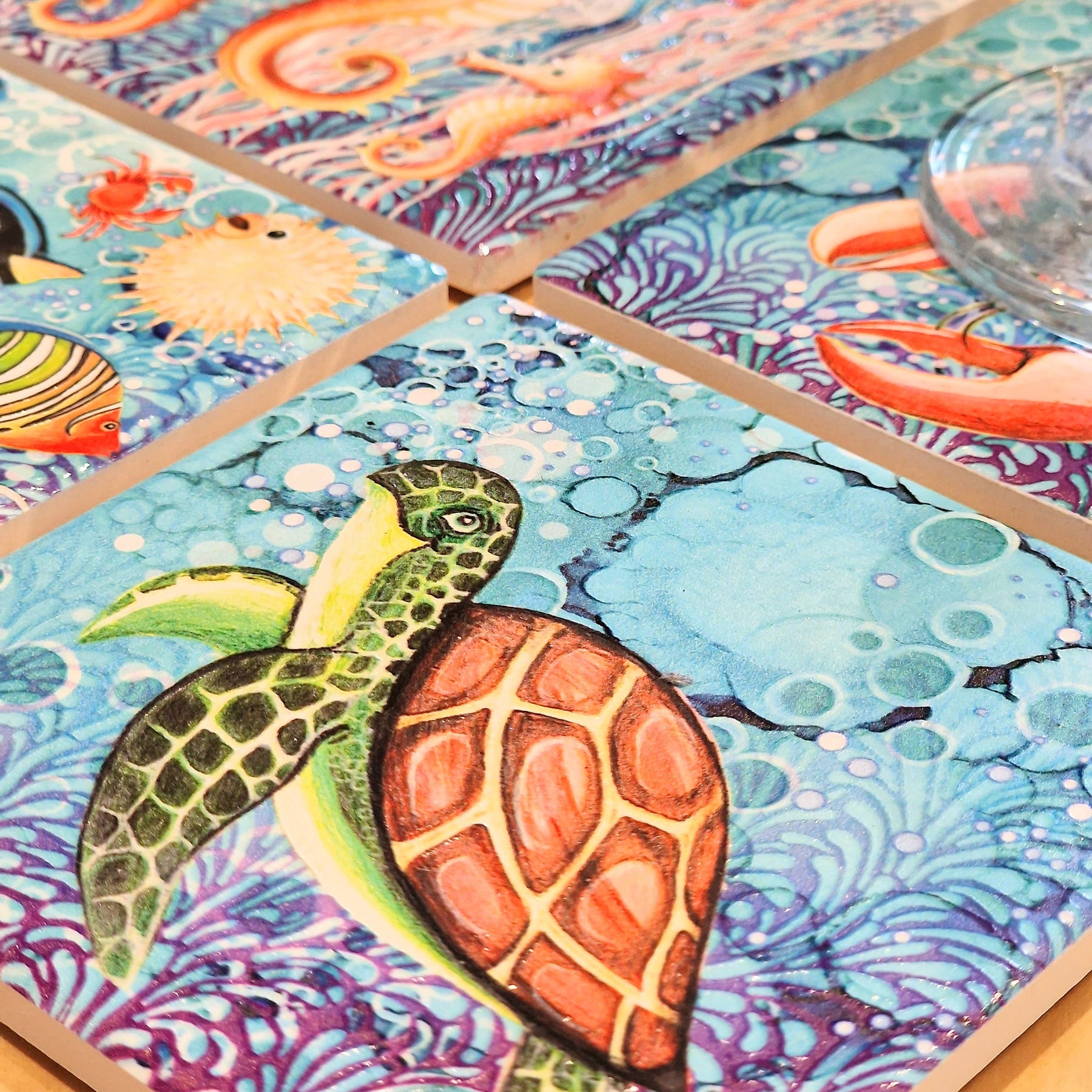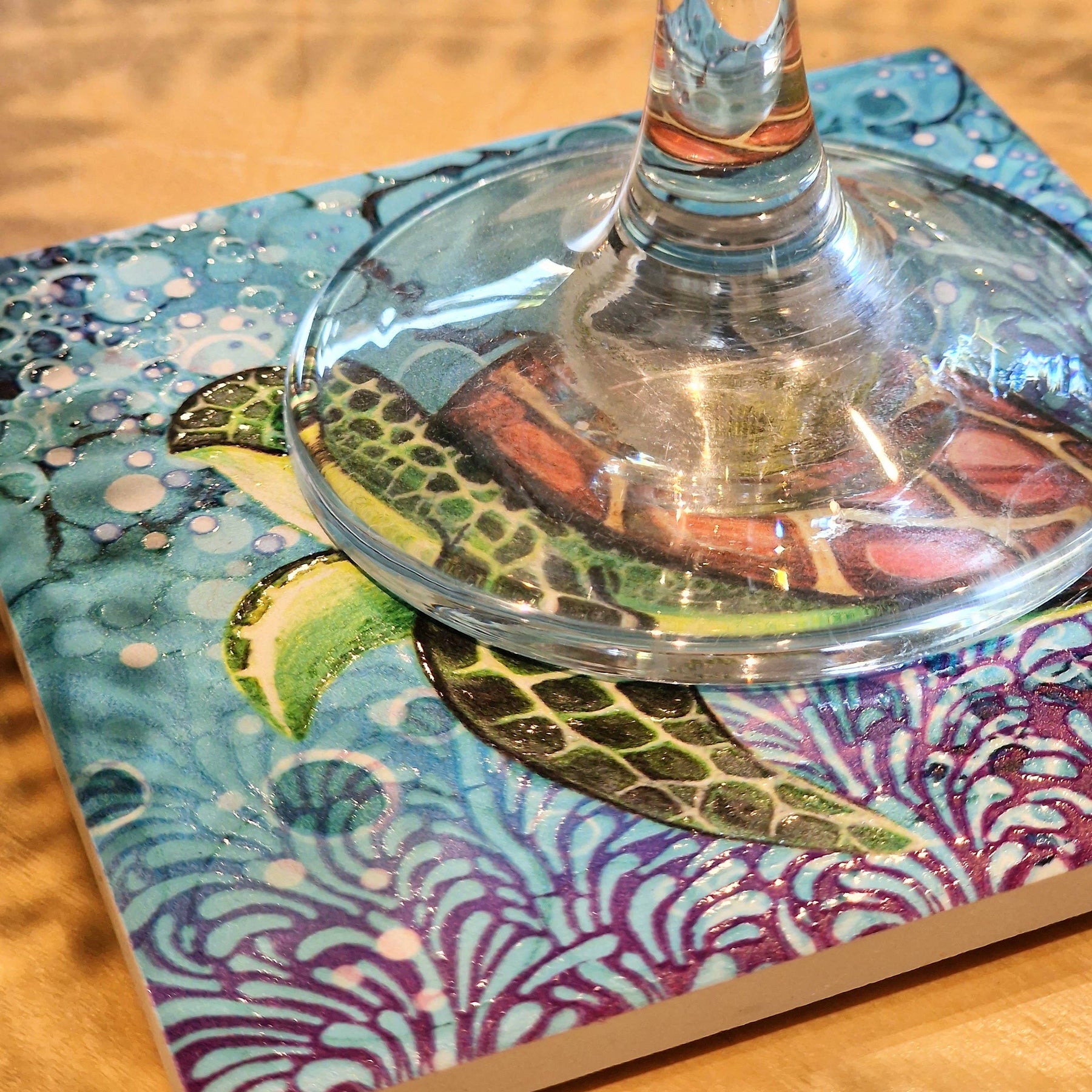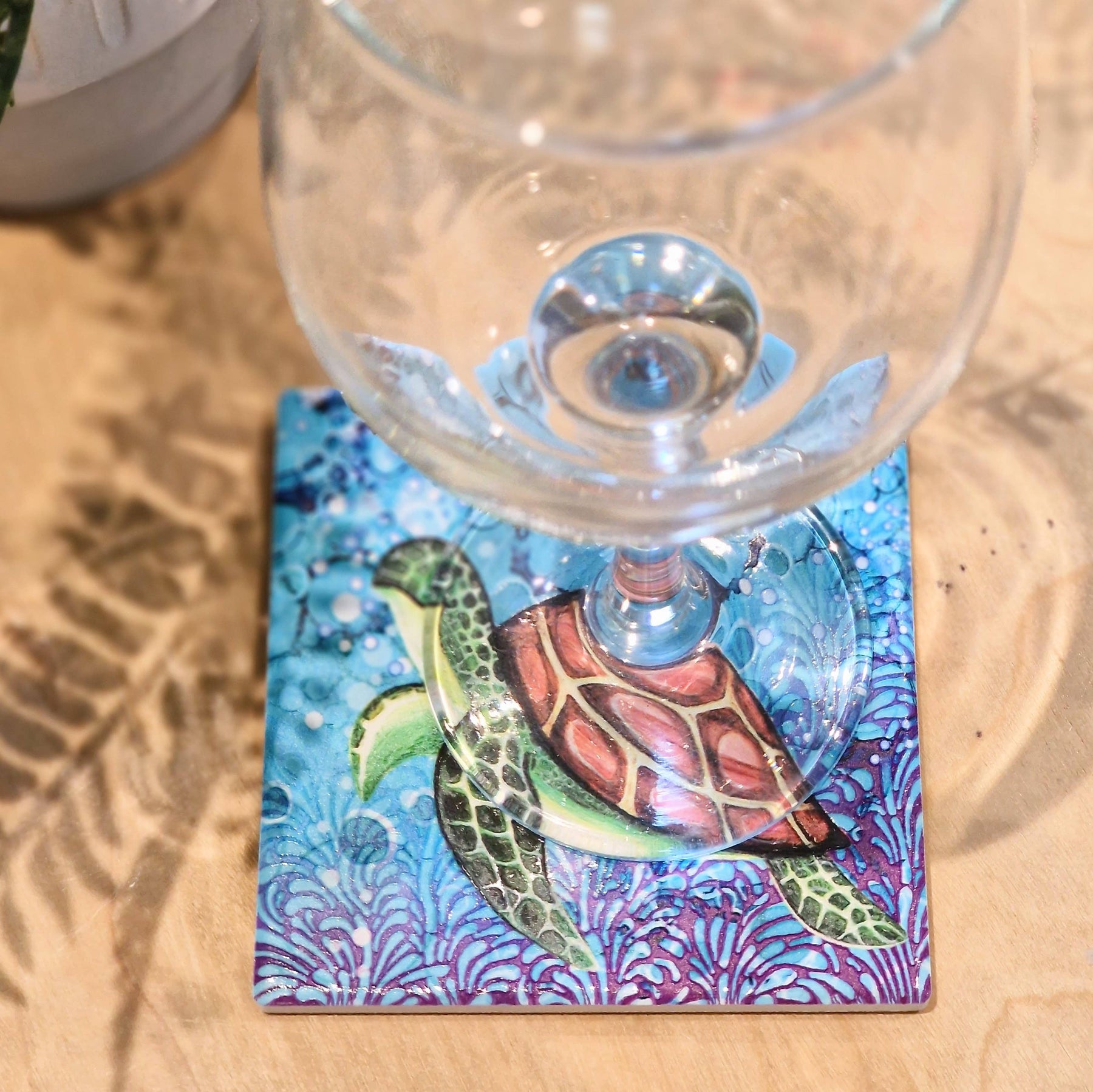 Colours inspired by nature and water, and these ceramic coasters are just that. The colours blend effortlessly on the ceramic bringing nature right into the room with you. MEASUREMENTS Each coaster measures 10cm square and comes with a cork back to prevent movement or scratching on the unit/ table and comes with an embossed texture, making them almost 3D like.