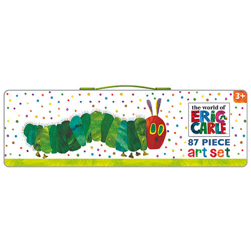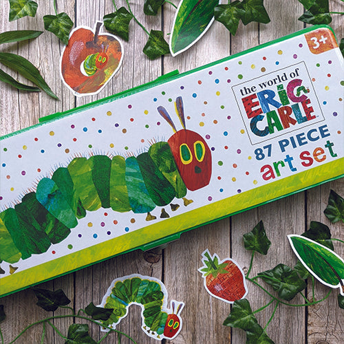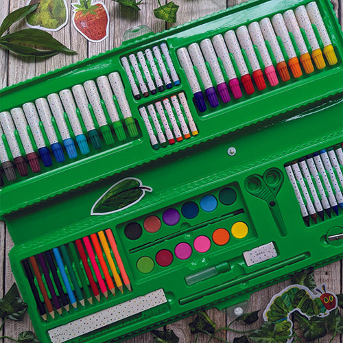 Spark your little one's imagination with this fantastic 87-piece art set inspired by The Very Hungry Caterpillar. Kids will have a blast picking from an array of paints, crayons, colouring pens, and more. Inside, you'll find 24 colouring pens, 12 colouring pencils, 12 paints, a mixing palette, paintbrush, 12 oil pastels, 12 crayons, plus essentials like a pencil, eraser, sharpener, glue, mini stapler, scissors, ruler, and paper clips. With charming Eric Carle designs on the crayons, oil pastels, and eraser, this set is a colourful treasure for any young artist!